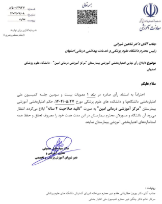 حکم اعتباربخشی آموزشی مرکز آموزشی درمانی امین با عنوان "تأیید صلاحیت چهار ساله" از سوی دبیرخانه شورای آموزش پزشکی و تخصصی وزارت بهداشت، درمان و آموزش پزشکی ابلاغ شد.